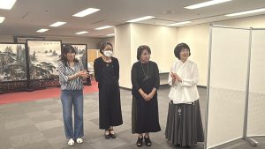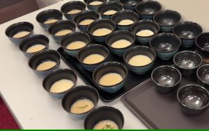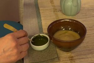 さて、水屋スタッフも佳境です。30人分の天目小碗を泡を立て、描く文字は『草、木、人、間』。