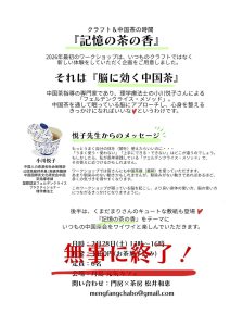 かねてよりお知らせしていた中国文化センターでのイベント『人形浄瑠璃をテーマとした中国茶藝 竹の茶、虎の茶~国姓爺合戦より』を、10/28に無事に終えることができました。 この茶藝の見どころは、前半の大虎と戦う『千里が竹虎 […]